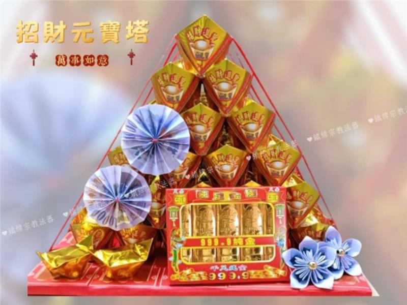 尾牙、新年必備的敬神好物 尾牙祭祀 怎能少了一座寓意滿滿的「招財元寶塔」!層層堆疊的金色元寶,不僅象徵財富與吉祥,更是敬神的誠意之選,漂亮又大方,讓祭桌更顯尊貴。 新年迎財神時,奉上一組閃耀的元寶塔,同樣充滿祝福與美意!無論是敬獻、祝壽、還願,或是參拜活動,「鎮緯宗教法器」的元寶塔都能讓儀式更加圓滿隆重。